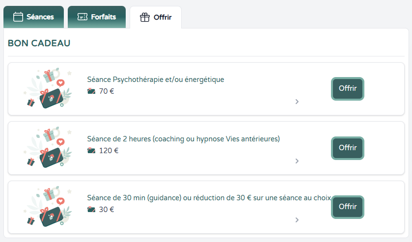 Tu peux directement cliquer sur l’onglet Offrir dans l’agenda Crenolibre et choisir le bon cadeau de ton choix.
